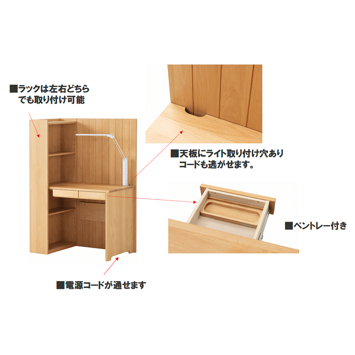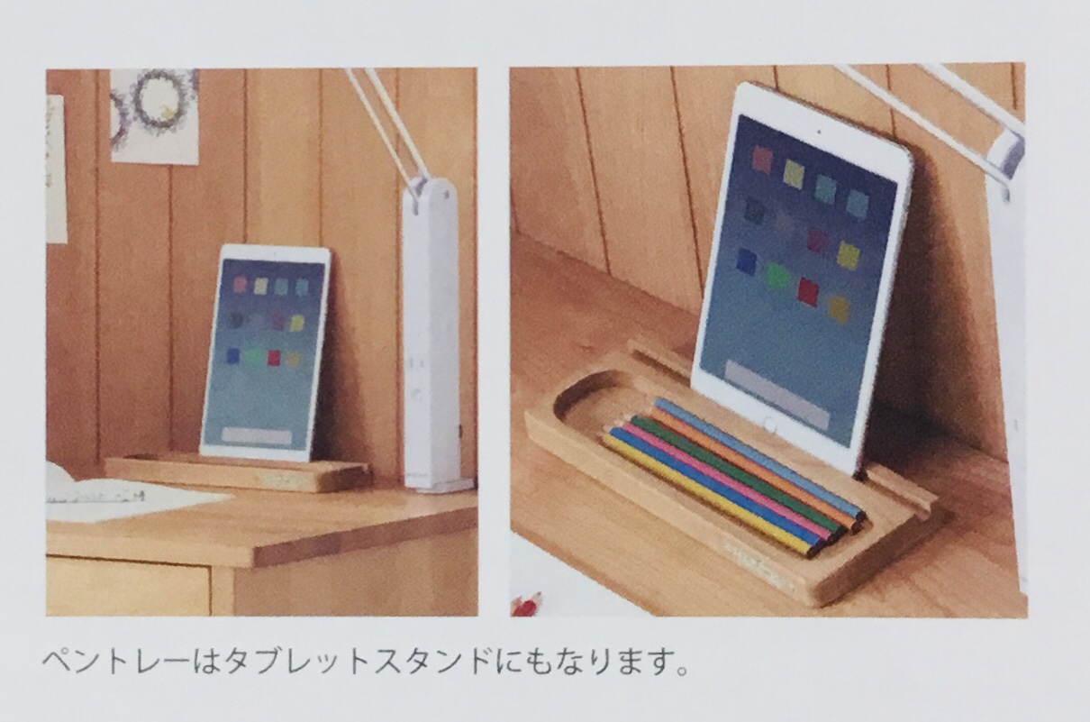 天板に照明を付けたり、コンセントコードを逃す切り欠き穴があったり、引き出しに入るペントレーはタブレットスタンドとしてもご使用頂けます。