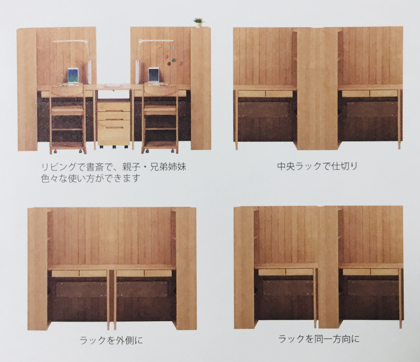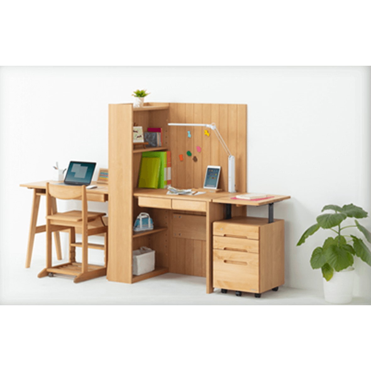 また、堀田木工所の学習デスクはどの商品もアルダー材ナチュラル色は共通なので「コンセ」と他のデスクを合わせてることもできます。