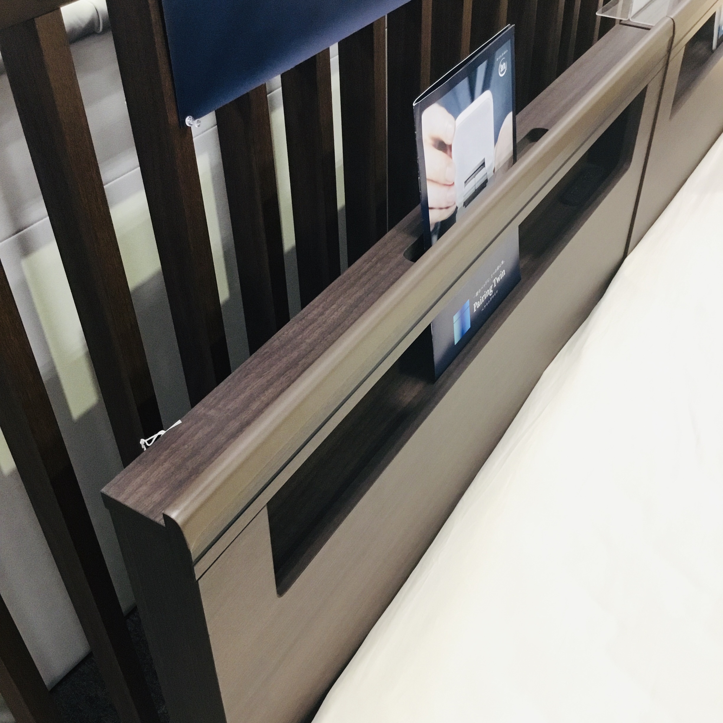 最低限枕元に必要なメガネや携帯電話、本などが置ける寸法になっており、2口コンセントが付いています。