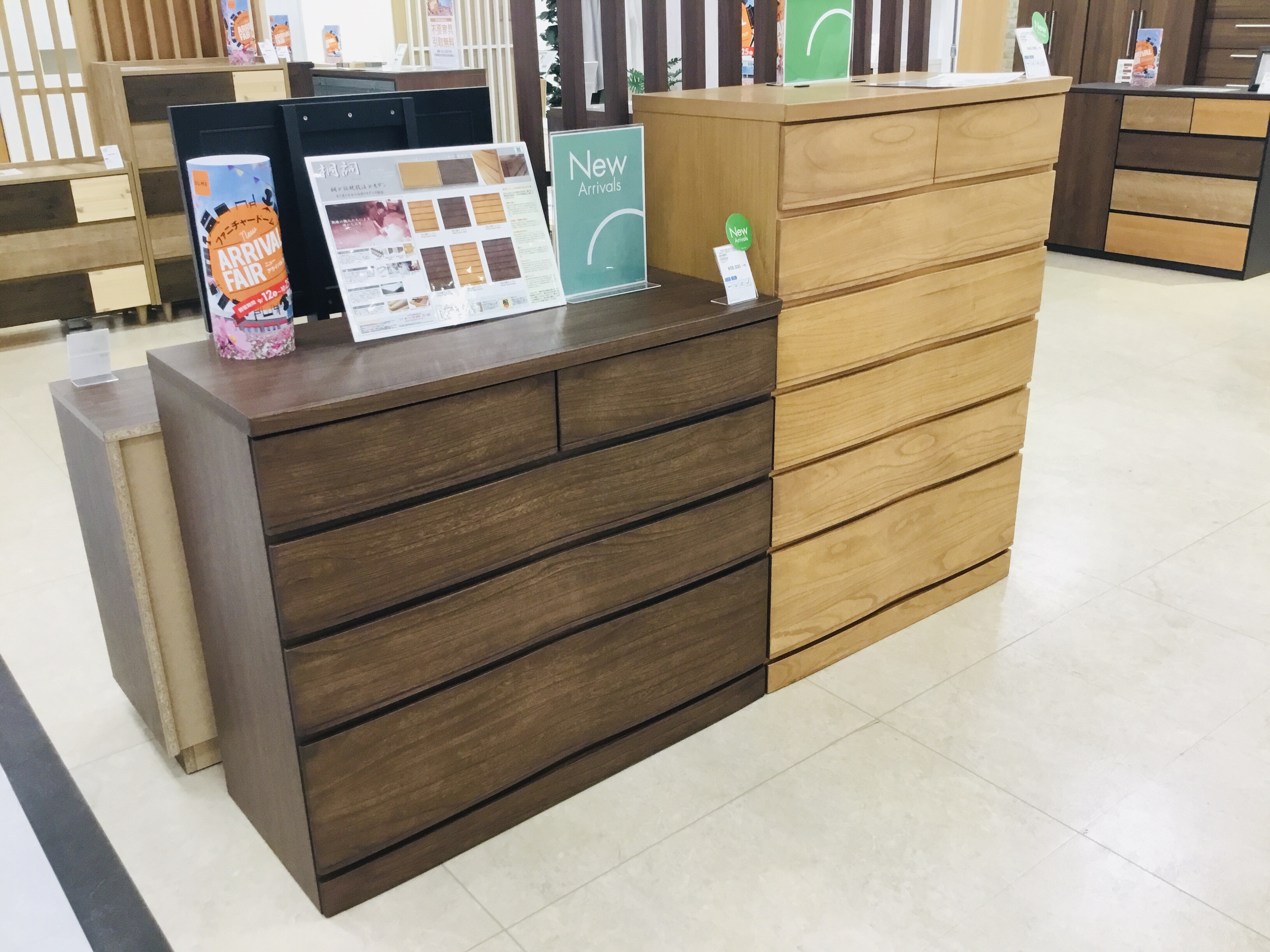タンス売場は、1階出入口、エスカレーターを正面に向かって左、奥の売場にございます。