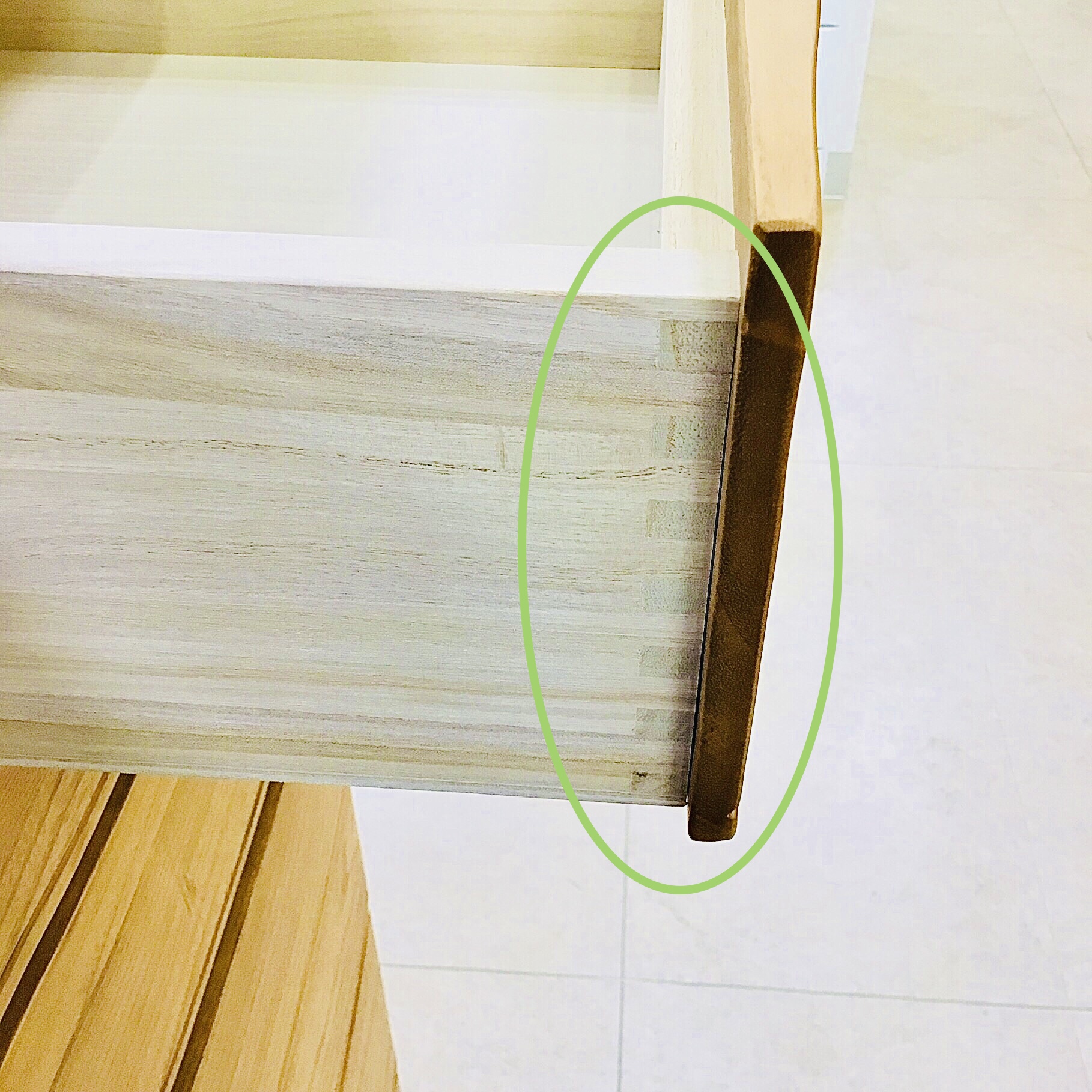 ⑥地板(タンス本体側の引出しと引出しの間の板)部分は、衣類を傷つけないよう桐シート化粧貼り加工を施しています。安価な商品だとベニヤ板がむき出しのものもございます。