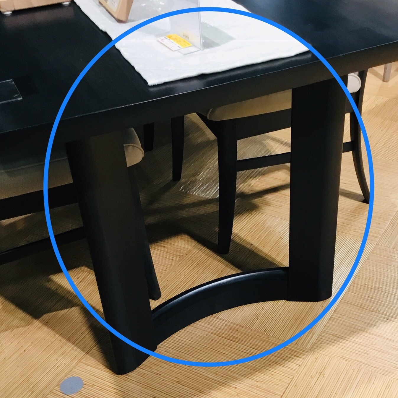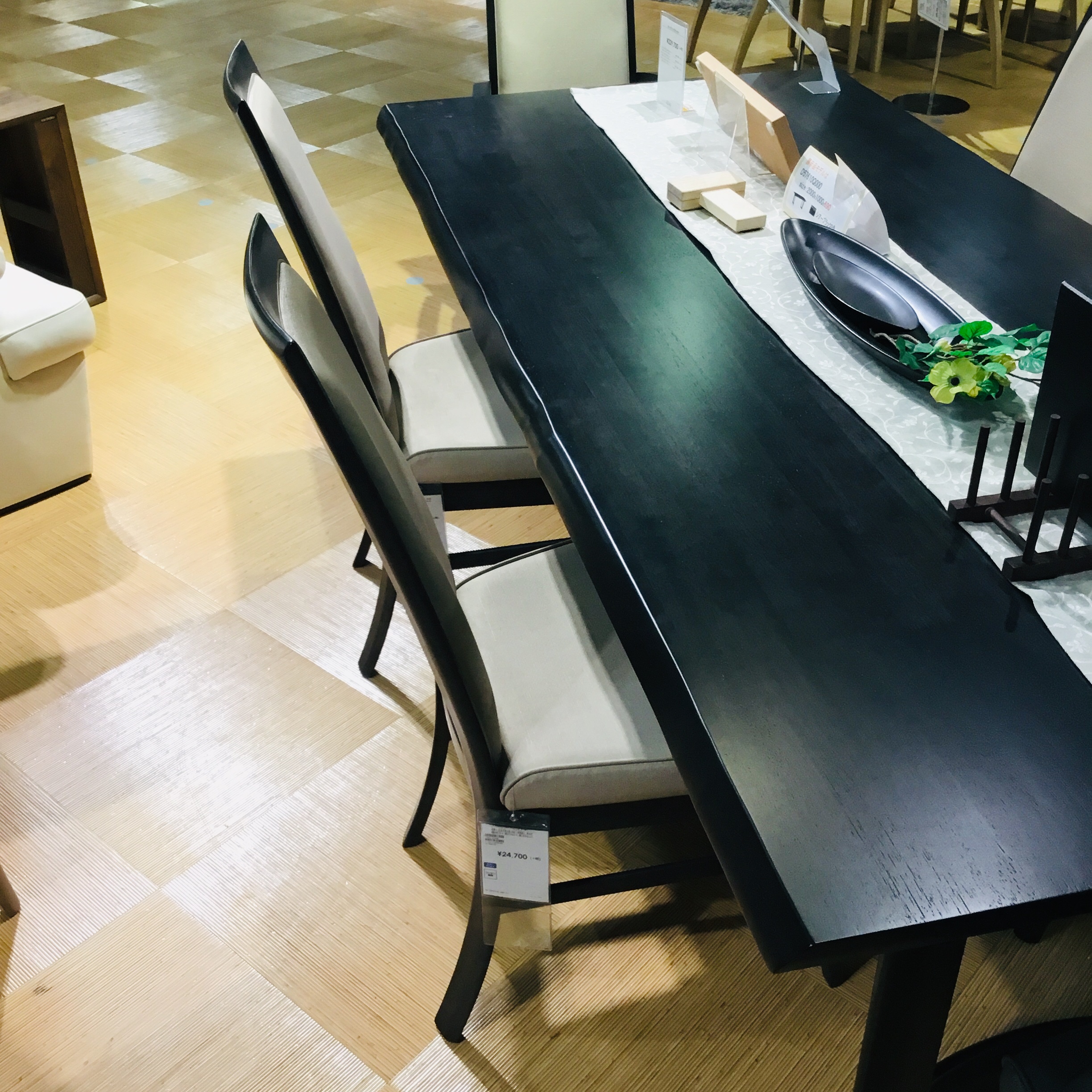 看板の出入口を入って正面のブラック色のダイニングセットが、今回ご紹介する商品です。