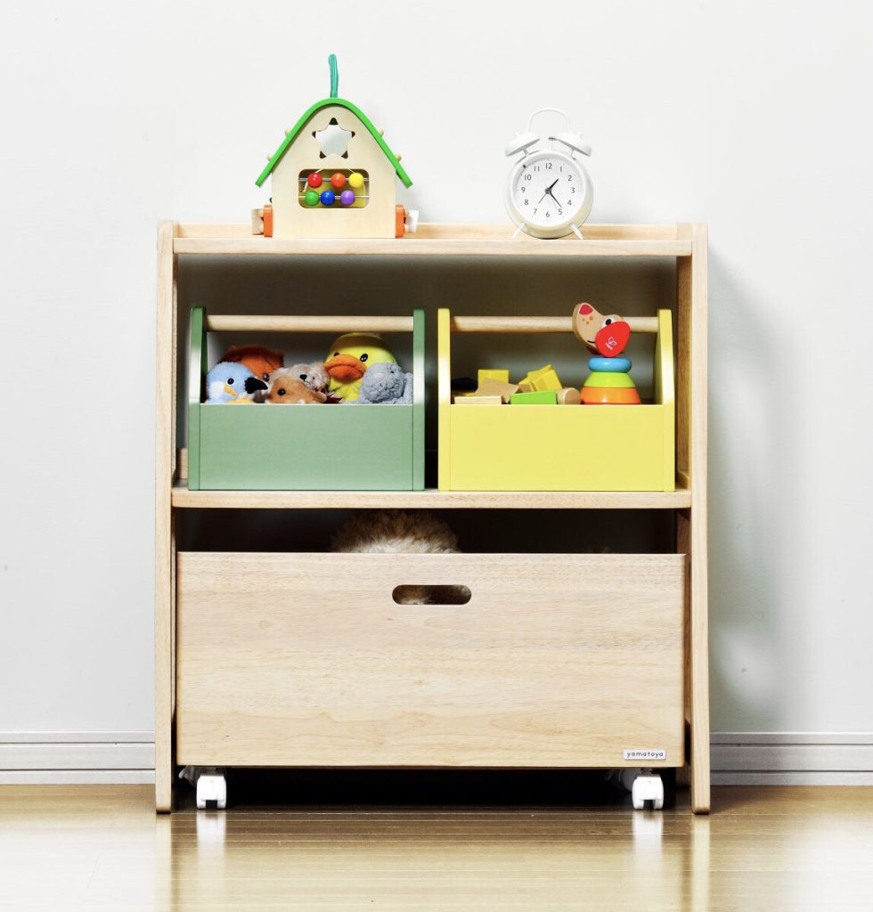 小さいおもちゃはボックスにまとめてスッキリ。下段のキャスター付きワゴンには大きいおもちゃがも入ります。