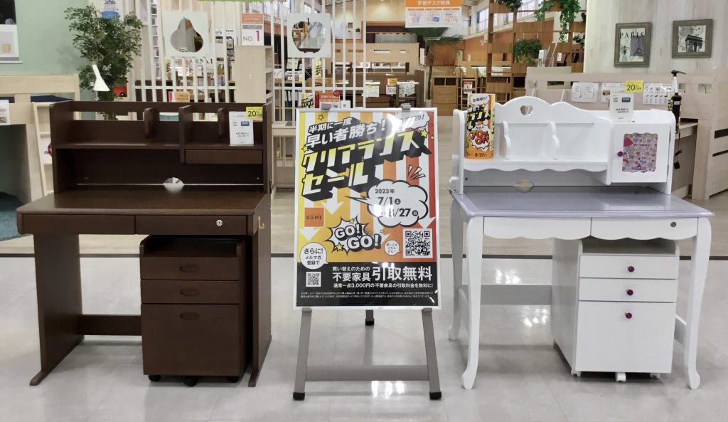 ファニチャードーム本店にお越しの際は、1階正面出入口右奥のデスク・書斎・ドレッサー・収納家具売場へお立ち寄り下さい。