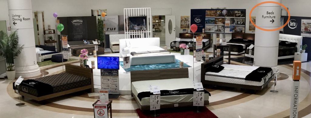 期間限定でご用意しているベッドは、エスカレーターで2階に上がって正面に広がる所からベッド売場にかけての通路に展示しています。