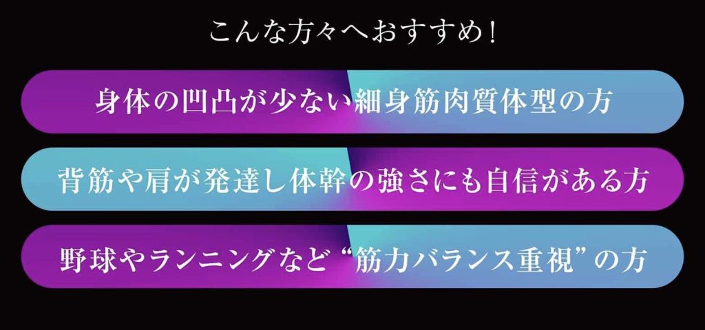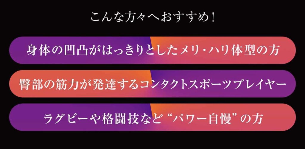 アスリートのような筋肉(マッスル)の多い少ないに関わらず、「横向き寝が多い」や「細身の体型」「ちょっと人より筋肉質」という方など、まずは眠る時の癖や体格で選んでみて下さい。
