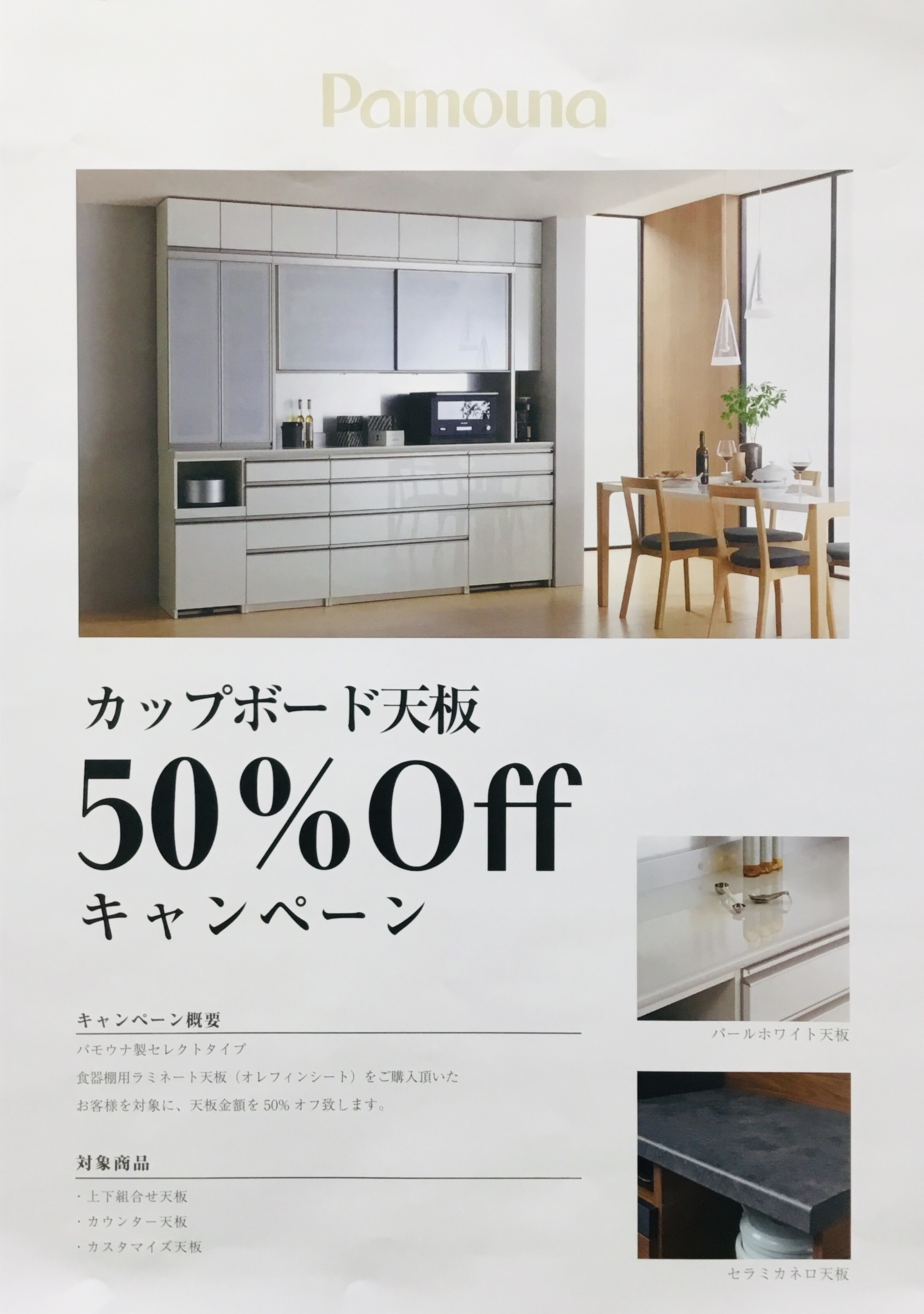 キッチンボードは、セレクトタイプ食器棚と合わせて、ラミネート天板(オレフィンシート)をご購入頂いた方を対象に、