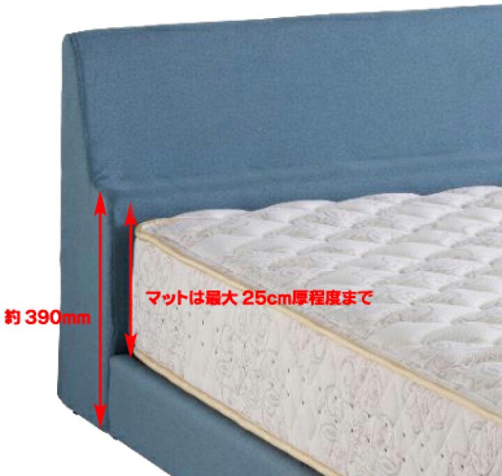 フレームの高さは61.5cm、床板面からヘッドボードの傾斜部までは約25cmで、マットレスの厚さが25cmを超えると段差ができて使いにくくなってしまいますので、マットレス選びには注意が必要です。