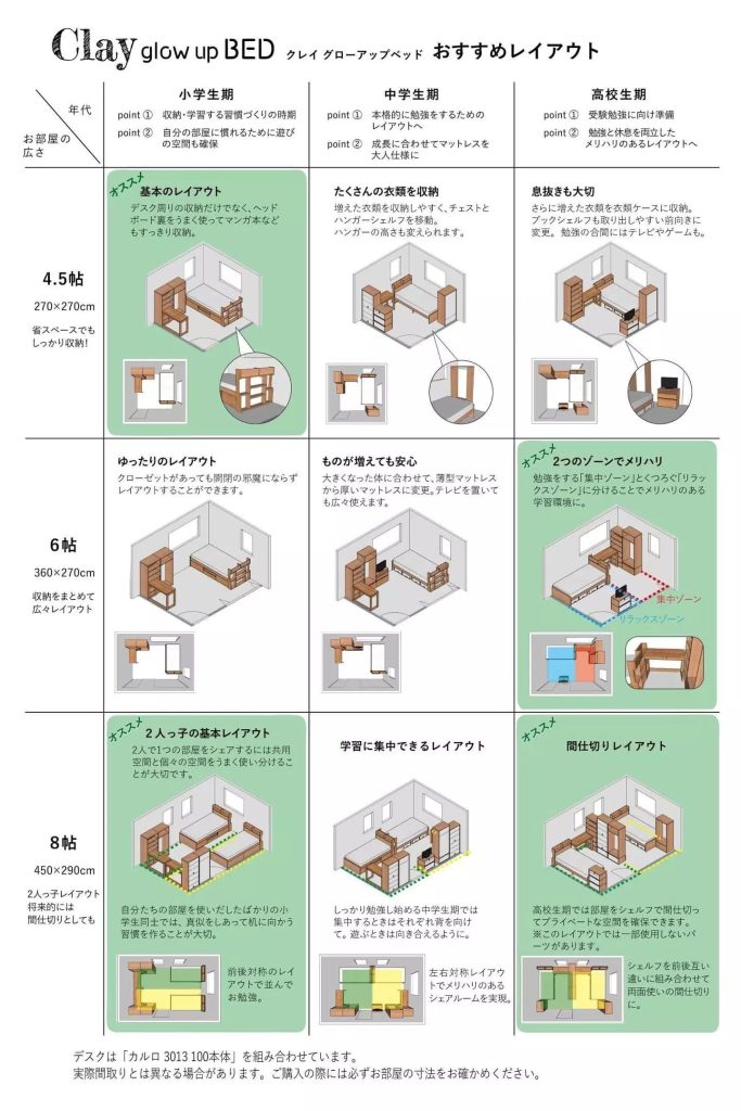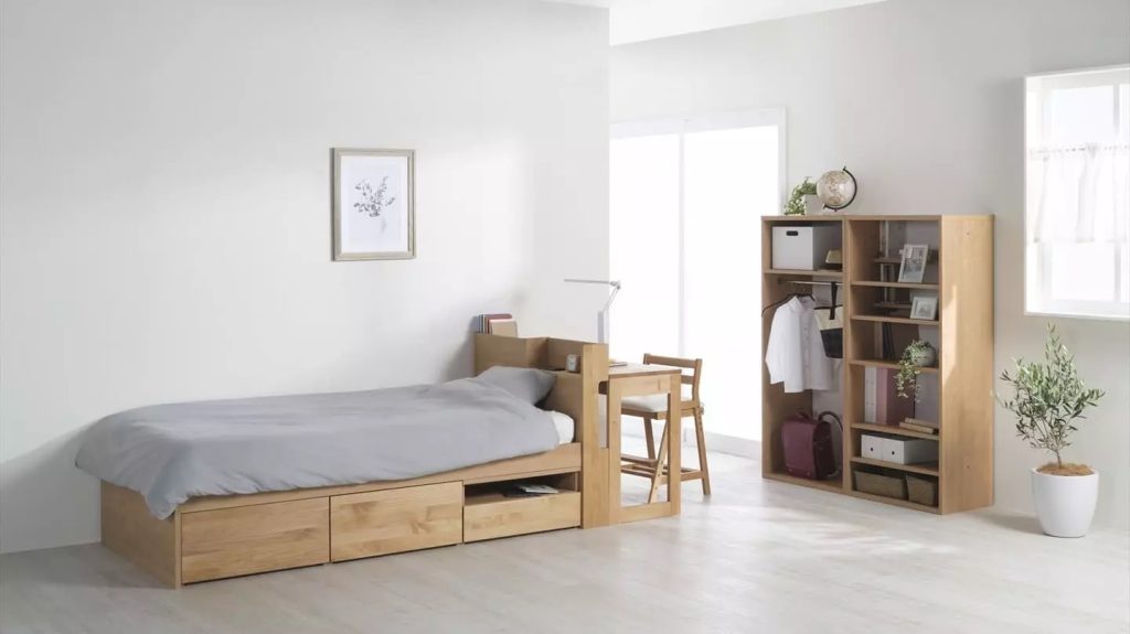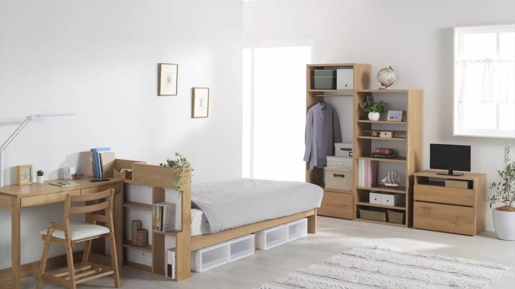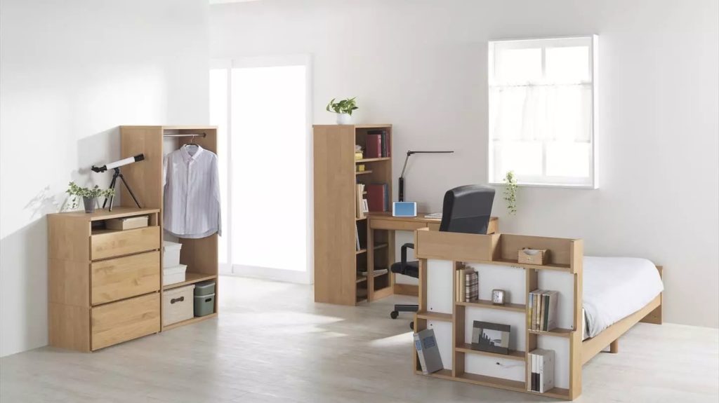 「シングルベッド」「浅型チェスト(引出し)」「深型チェスト(引出し)」「ハンガーシェルフ」「ブックシェルフ」からなる、6種類のアイテムを使って間取りに合わせて組み合せたり、成長に合わせてレイアウトを変更することができます。