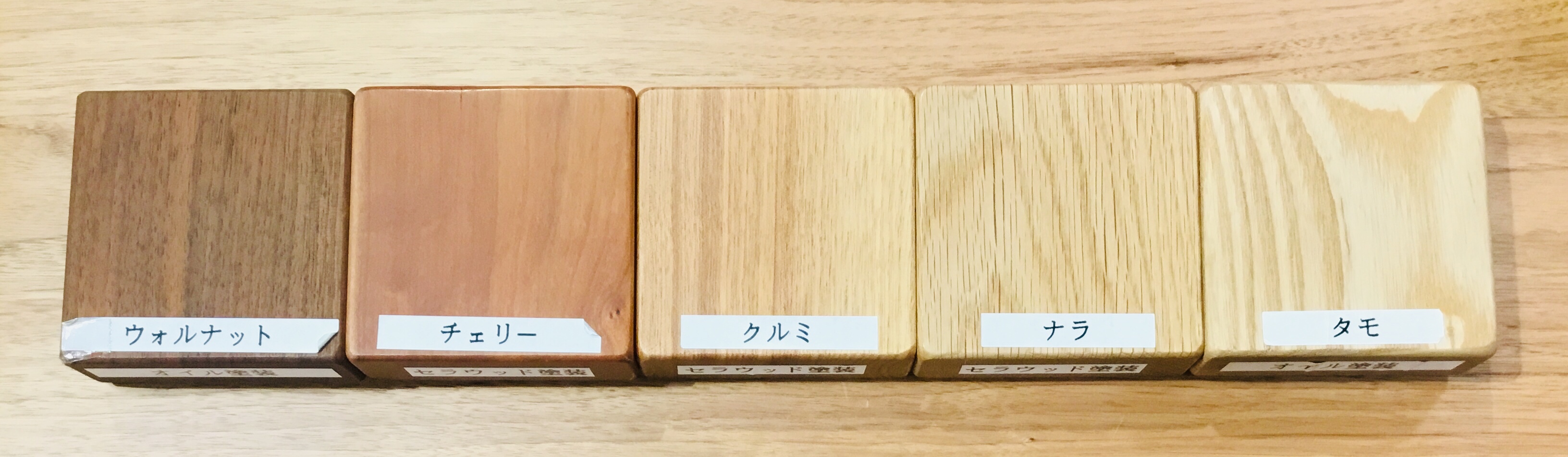 材種はタモ・クルミ・オーク・チェリー・ウォールナットの5種類、塗装はセラミック塗装とオイル塗装の2種類からお選び頂けます。